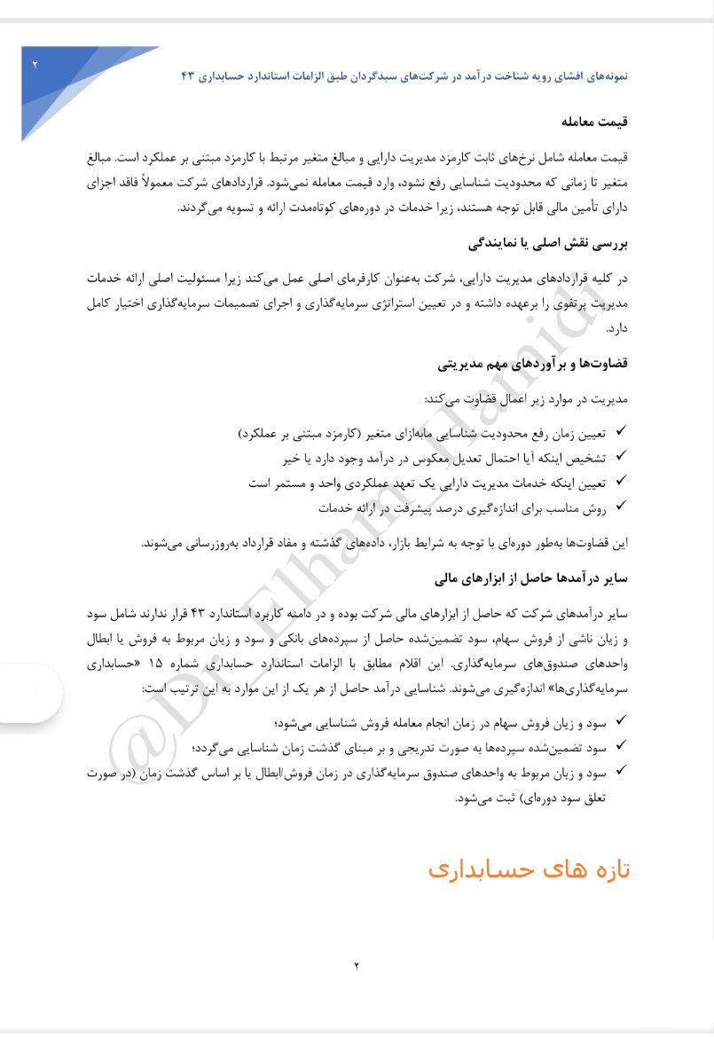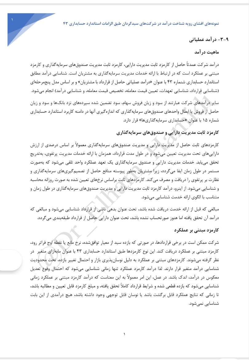 با توجه به اینکه بخشی از درآمد این شرکتها (از جمله خدمات مشاوره، کارمزد مدیریت صندوقهای سرمایهگذاری و کارمزد مدیریت دارایی) در دامنه کاربرد استاندارد حسابداری ۴۳ قرار میگیرند، و بخشی دیگر از درآمد آنها مانند سود سهام، درآمد بهره و سایر عواید ناشی از داراییهای مالی از شمول این استاندارد خارج هستند، این نمونه تصویری از نحوه تفکیک و افشای این موارد در صورتهای مالی ارائه میکند.