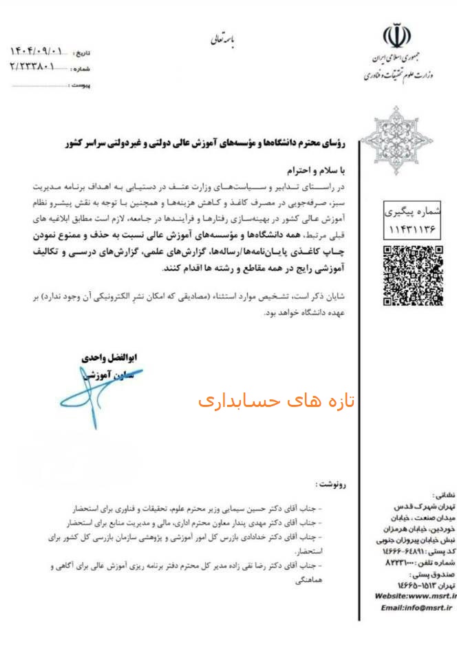 در راستای تدابیر و سیاستهای وزارت عشق در دستیابی به اهداف برنامه مدیریت سبز، صرفهجویی در مصرف کاغذ و کاهش هزینهها و همچنین با توجه به نقش پیشرو نظام آموزش عالی کشور در بهینهسازی رفتارها و فرآیندها در جامعه لازم است مطابق ابلاغیههای قیلی مرتبط همه دانشگاهها و مؤسسههای آموزش عالی نسبت به حذف و ممنوع نمودن چاپ کاغذی پایاننامهها، رسالهها، گزارشهای علمی، گزارشهای درسی و تکالیف آموزشی رایج در همه مقاطع و رشتهها اقدام کنند.