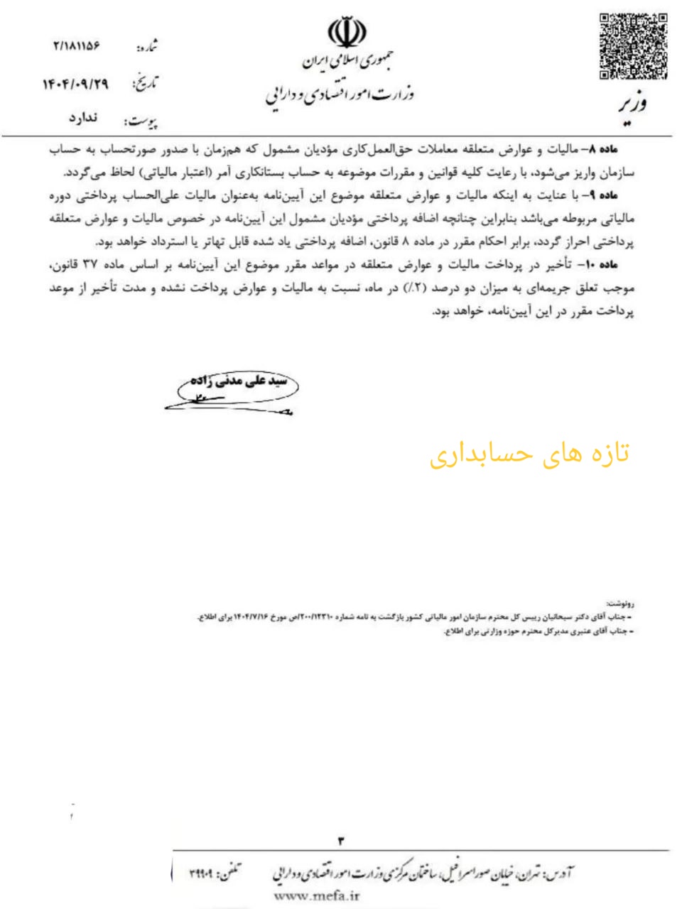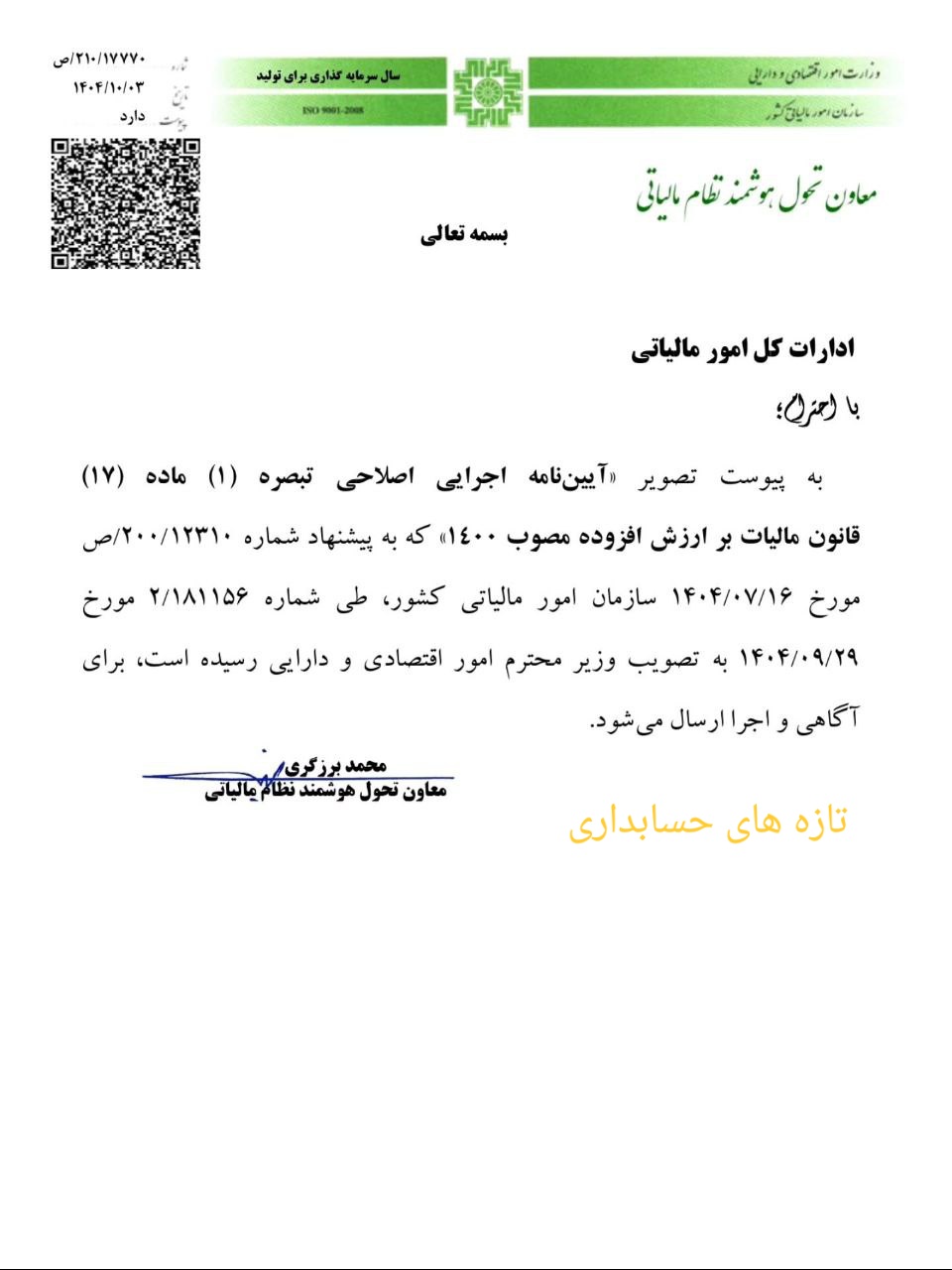معاون هوشمند نظام مالیاتی آیین نامه اصلاحی اجرایی تبصره یک ماده ۱۷ قانون دایمی ارزش افزوده ۱۴٠۴/۱٠/٠۳ ( مصوب ۲۹/ ۹/ ۱۴۰۴ وزیر امور اقتصادی و دارایی ) را ابلاغ کرد.