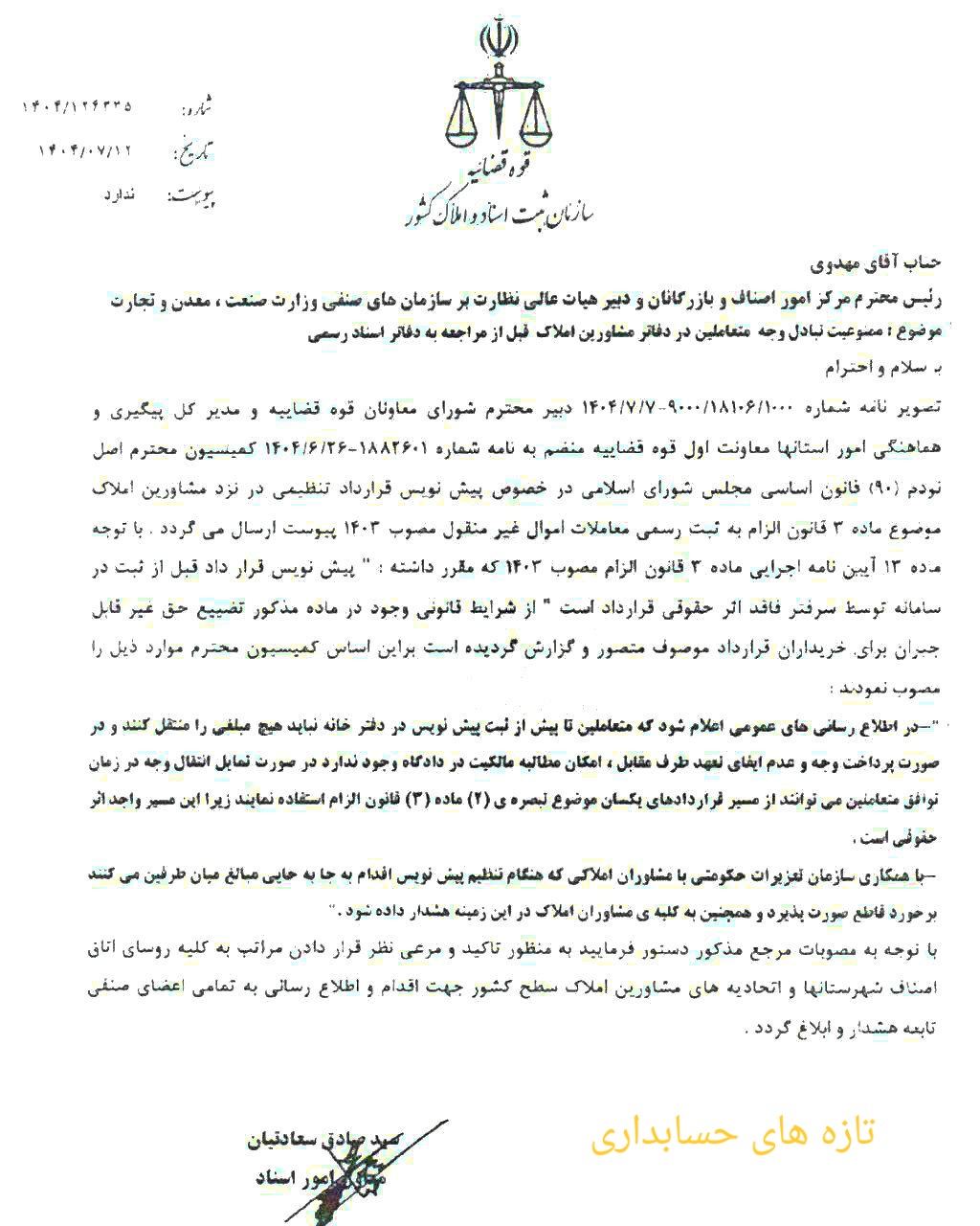بخشنامه ممنوعیت پرداخت وجه معامله در بنگاههای املاک اخبار مجامع حرفه اي در دی 1, 1404 0 7 به اشتراک گذاری سازمان ثبت اسناد و املاک طی بخشنامه ای پرداخت وجه معامله در بنگاههای املاک قبل از ثبت رسمی پیشنویس قراردادها توسط دفتر اسناد رسمی را اعلام کرد. بنگاههای املاکپیشنویس قراردادسازمان ثبت اسناد و املاکشماره 126325 0 7 به اشتراک گذاری