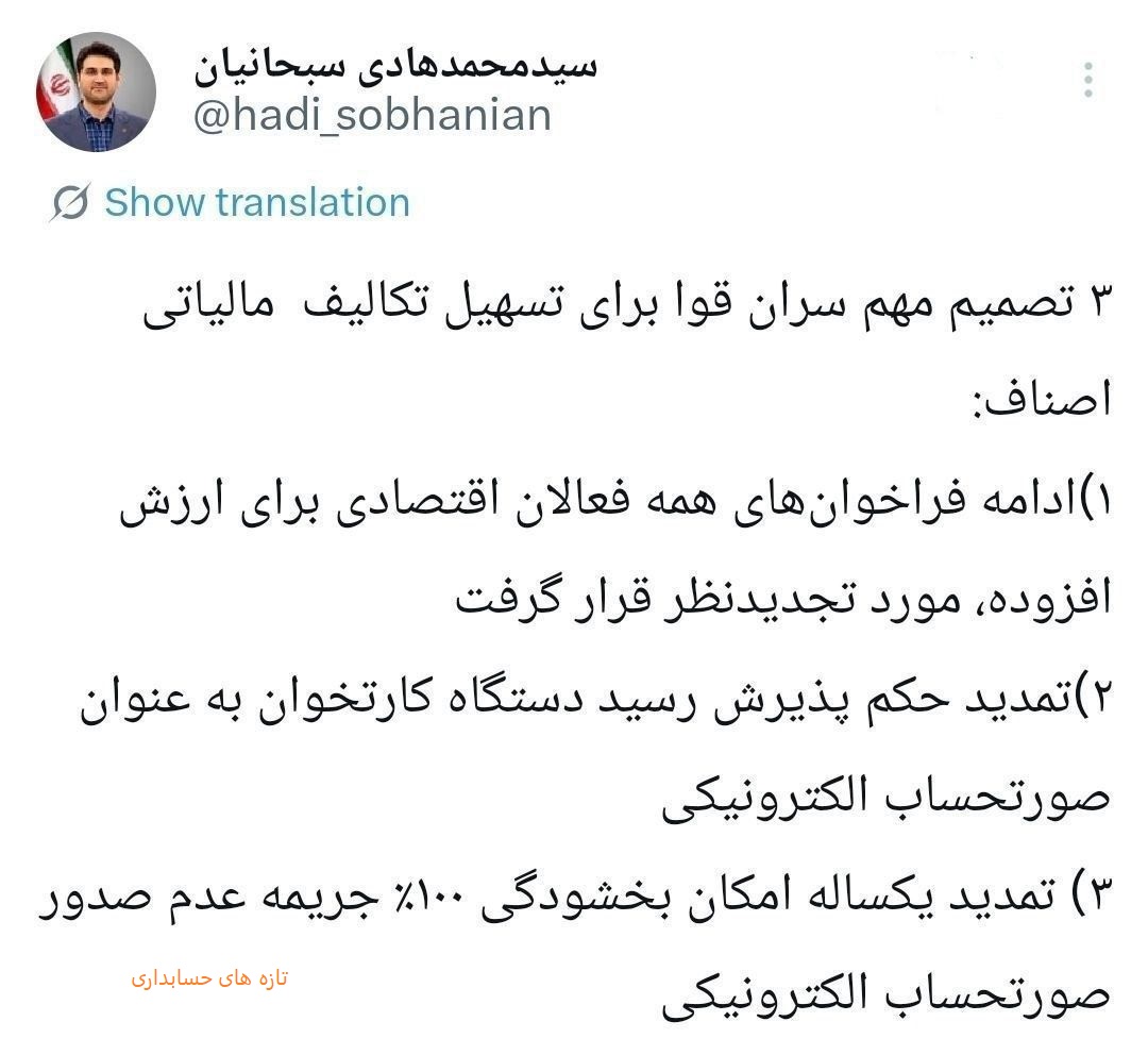 سبحانیان رئیس سازمان امور مالیاتی:سه تصمیم سران قوا برای تسهیل تکالیف مالیاتی اصناف
