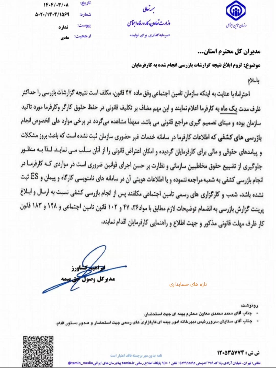 احتراما با عنایت به اینکه سازمان تامین اجتماعی وفق ماده ۴۷ قانون مکلف است نتیجه گزارشات بازرسی را حداکثر ظرف مدت یک ماه به کارفرما اعلام نمایند و این مهم مضاف بر تکلیف قانونی در حفظ حقوق کارگر و کارفرما مورد تاکید سازمان بوده و مبنای تصمیم گیری مراجع قانونی میباشد.