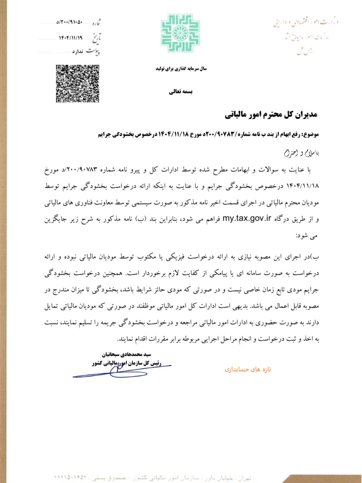 با عنایت به سوالات و ابهامات مطرح شده توسط ادارات کل و پیرو نامه شماره ۲۰۰/۹۰۷۸۳/د مورخ ۱۴۰۴/۱۱/۱۸ در خصوص بخشودگی جرایم و با عنایت به اینکه ارائه درخواست بخشودگی جرایم توسط مودیان محترم مالیاتی در اجرای قسمت اخیر نامه مذکور به صورت سیستمی توسط معاونت فناوری های مالیاتی و از طریق درگاه my.tax.gov.ir فراهم میشود بنابراین بند (ب) نامه مذکور به شرح زیر جایگزین میشود: