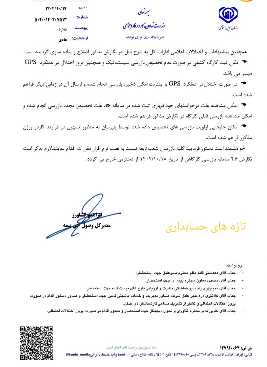 -گزارش بازرسی قابلیت ثبت و ویرایش دقیق دارد مسیریابی GPS و ثبت موقعیت کارگاه فعال شده است یعنی دیگر مغایرت دستمزد و عنوان شغلی پنهان نمی ماند