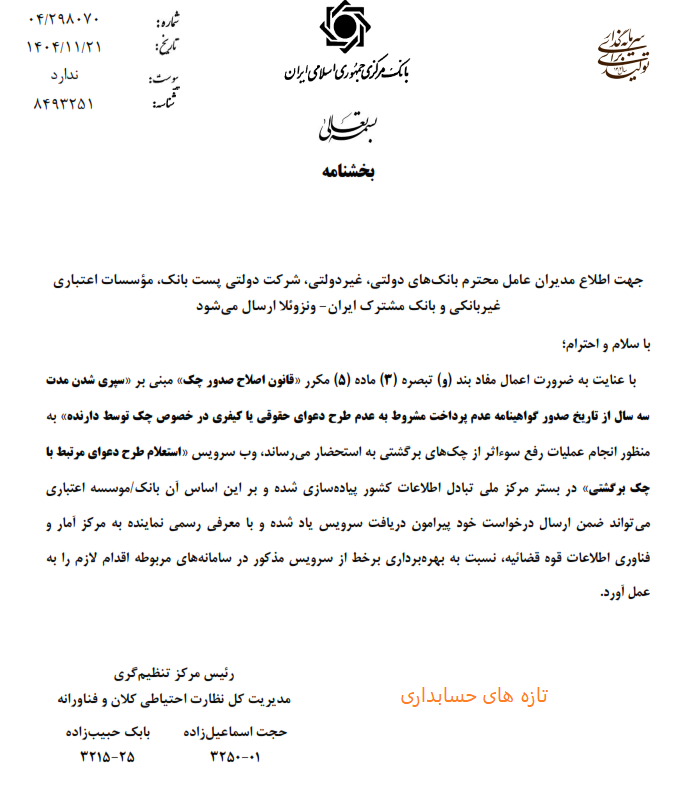 به گزارش روابط عمومی بانک مرکزی، با توجه به ضرورت اعمال مفاد بند (و) تبصره (۳) ماده (۵) مکرر قانون اصلاح صدور چک مبنی بر «سپری شدن مدت سه سال از تاریخ صدور گواهینامه عدم پرداخت مشروط به عدم طرح دعوای حقوقی یا کیفری در خصوص چک توسط دارنده به منظور انجام عملیات رفع سوء اثر از چک های برگشتی، وب سرویس استعلام طرح دعوای مرتبط با چک برگشتی در بستر مرکز ملی تبادل اطلاعات کشور پیاده سازی شده است.