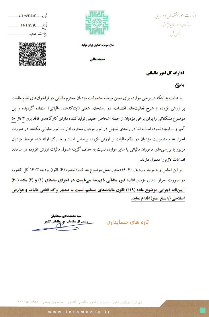 بر اساس تصمیم جدید سازمان امور مالیاتی کشور، در مواردی که تشخیص مرحله مشمولیت مودیان بر اساس اینتاکدهای مالیاتی (رستههای شغلی) منجر به بروز اشکال برای برخی فعالان اقتصادی از جمله اشخاص حقیقی تولیدکننده با کارگاههای فاقد برق سهفاز ۵۰ آمپر شده باشد، ادارات امور مالیاتی مکلفند پس از بررسی مدارک و مستندات مودیان و در صورت احراز عدم شمولیت در نظام مالیات بر ارزش افزوده، نسبت به حذف گزینه شمول مالیات بر ارزش افزوده در سامانه اقدام کنند.