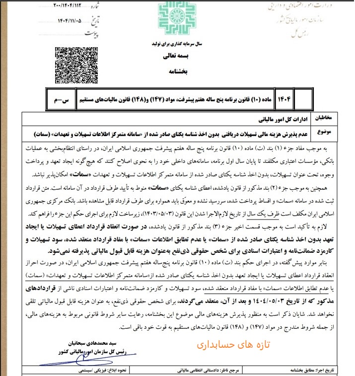 سازمان امور مالیاتی کشور اعلام کرد: بر اساس بند (ت) ماده (۱۰) قانون برنامه هفتم پیشرفت جمهوری اسلامی ایران، از تاریخ ۳ مرداد ۱۴۰۴ به بعد، هرگونه قرارداد تسهیلات، ضمانتنامه یا اعتبار اسنادی که بدون اخذ شناسه یکتای صادر شده از سامانه سمات منعقد شود یا اطلاعات آن با مفاد قرارداد تطابق نداشته باشد، سود و کارمزد آن هزینه قابلقبول مالیاتی برای شخص حقوقی ذینفع محسوب نمیشود.