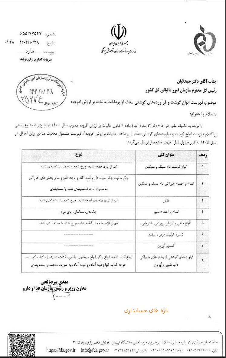 از سوی سازمان امور مالیاتی کشور، فهرست انواع گوشت سفید و قرمز و فرآوردههای گوشتی و پروتئینی معاف از مالیات بر ارزش افزوده موضوع جزء (۵-۴) بند (الف) ماده (۹) قانون مالیات بر ارزش افزوده مصوب سال ۱۴۰۰، جهت اجرا در سال ۱۴۰۵ ابلاغ شد.