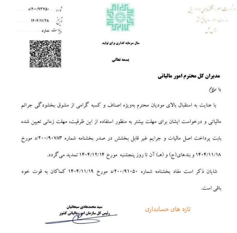 سازمان امور مالیاتی کشور با صدور اطلاعیه ای اعلام کرد: با عنایت به استقبال بالای مودیان محترم به ویژه اصناف و کسبه گرامی از مشوق بخشودگی جرایم مالیاتی و درخواست ایشان برای مهلت بیشتر به منظور استفاده از این ظرفیت، مهلت زمانی تعیین شده بابت پرداخت اصل مالیات و جرایم غیرقابلبخشش، مهلت زمانی فوق تا روز پنجشنبه مورخ ۱۴ اسفند ۱۴۰۴ تمدید می شود.