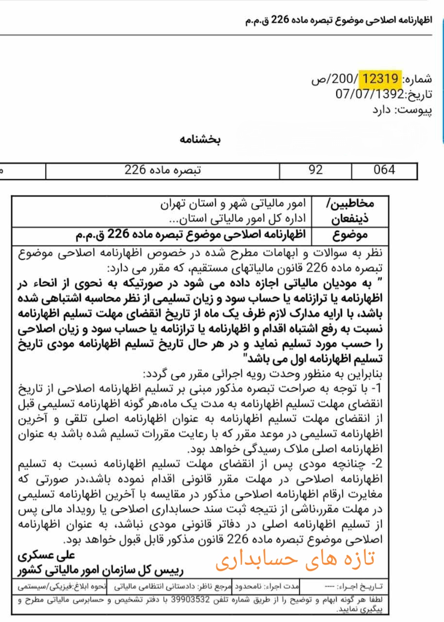 نظر به سؤالات و ابهامات مطرح شده در خصوص اظهارنامه اصلاحي موضوع تبصره ماده ۲۲۶ قانون مالياتهاي مستقيم، که مقرر مي دارد: