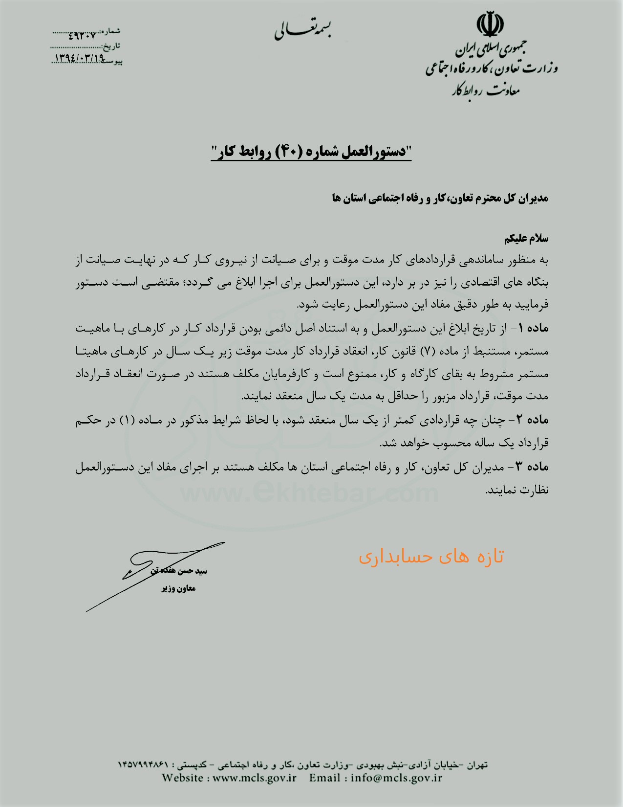 از تاریخ ابلاغ این دستورالعمل و به استناد اصل دائمی بودن قرارداد کار در کارهای با ماهیت مستمر، مستنبط از ماده (۷) قانون کار، انعقاد قرارداد کار موقت زیر یکسال در کارهای ماهیتا مستمر مشروط به بقای کارگاه و کار، ممنوع است و کارفرمایان مکلف هستند در صورت انعقاد قرارداد مدت موقت، قرارداد مزبور را حداقل به مدت یکسال منعقد نمایند.
