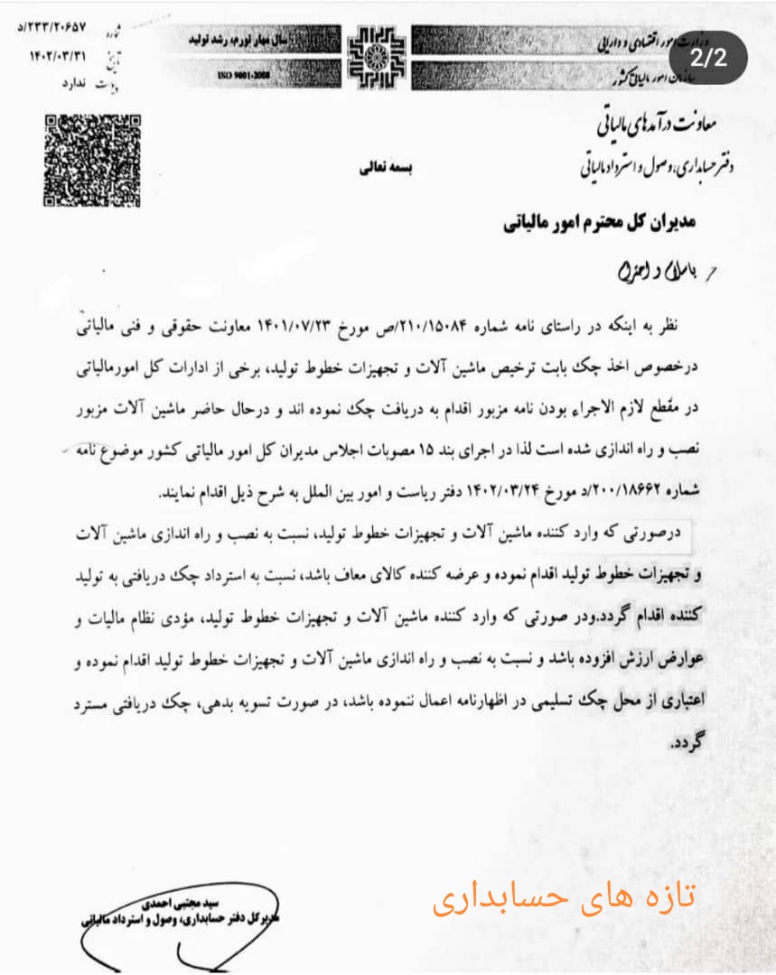نحوه اقدام ادارات امور مالیاتی در خصوص چک های اخذ شده بابت مالیات بر ارزش افزوده واردات ماشین آلات و تجهیزات خطوط تولید تشریح شد.