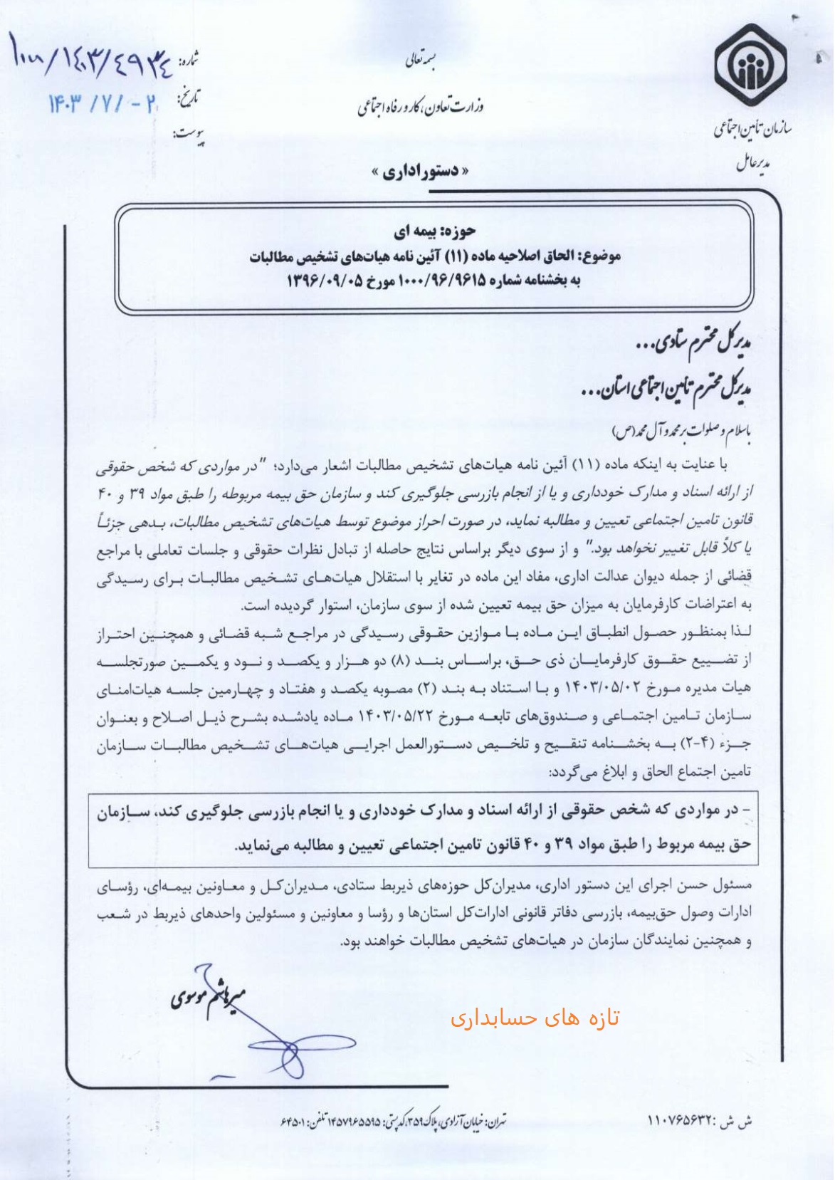 الحاق اصلاحیه ماده ۱۱ آئین نامه هیات های تشخیص مطالبات در خصوص عدم همکاری با حسابرسان تامین اجتماعی می باشد.