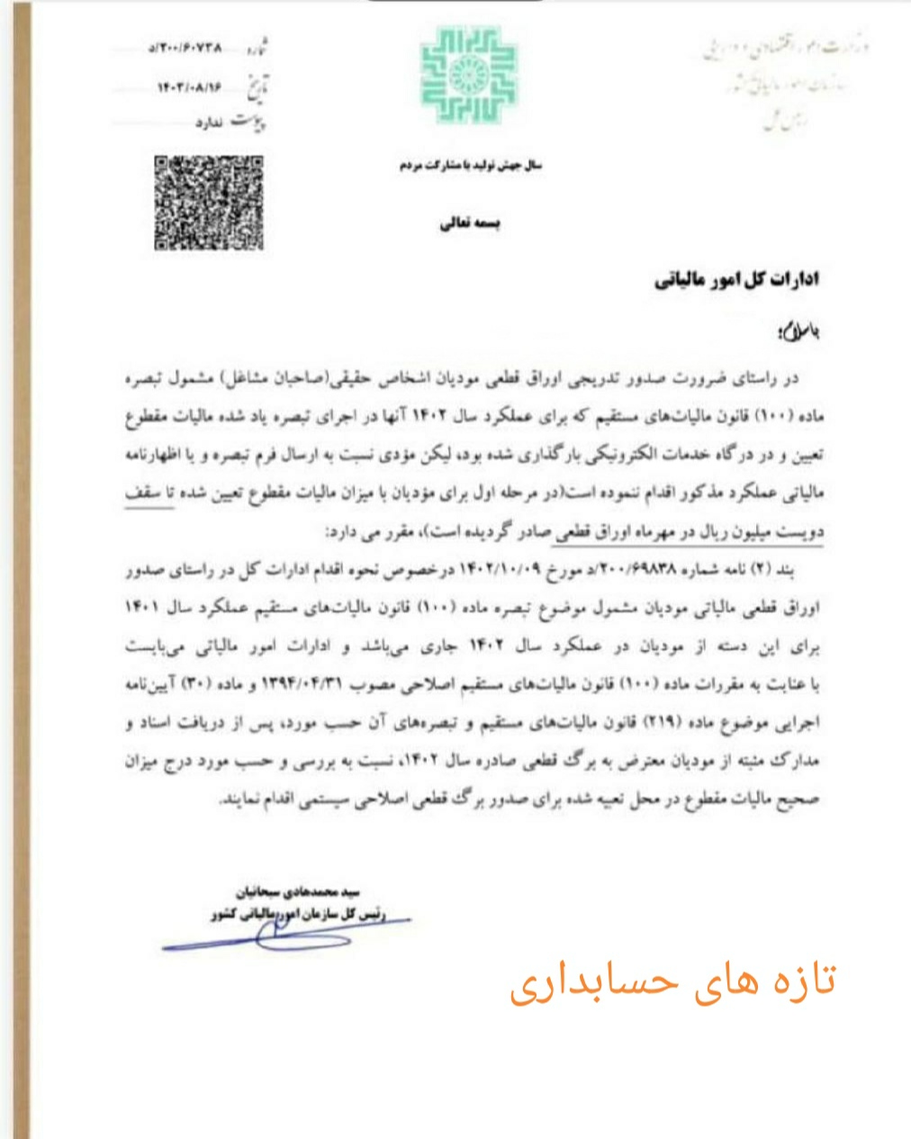 بخشنامه :۵/۲۰۰/۶۰۷۳۸ تاریخ:۱۴۰۳/۰۸/۱۶ سازمان امور مالیاتی موضوع نحوه صدور برگ قطعی اصلاحی بر اساس اسناد و مدارک مثبته ابلاغ شد.