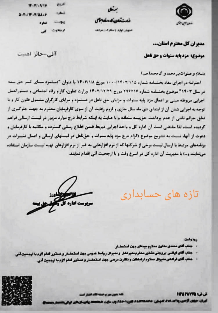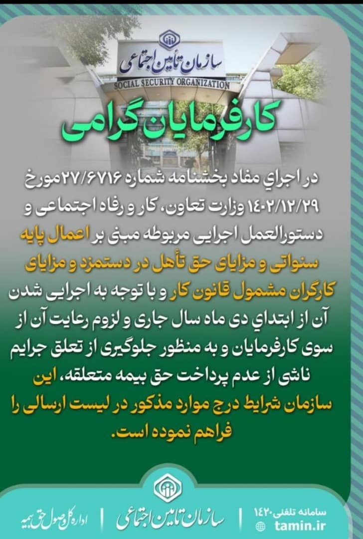 اطلاعیه سازمان تأمین اجتماعی درخصوص اعمال پایه سنواتی و مزایای حق تاهل در دستمزد و مزایا منتشرشد.