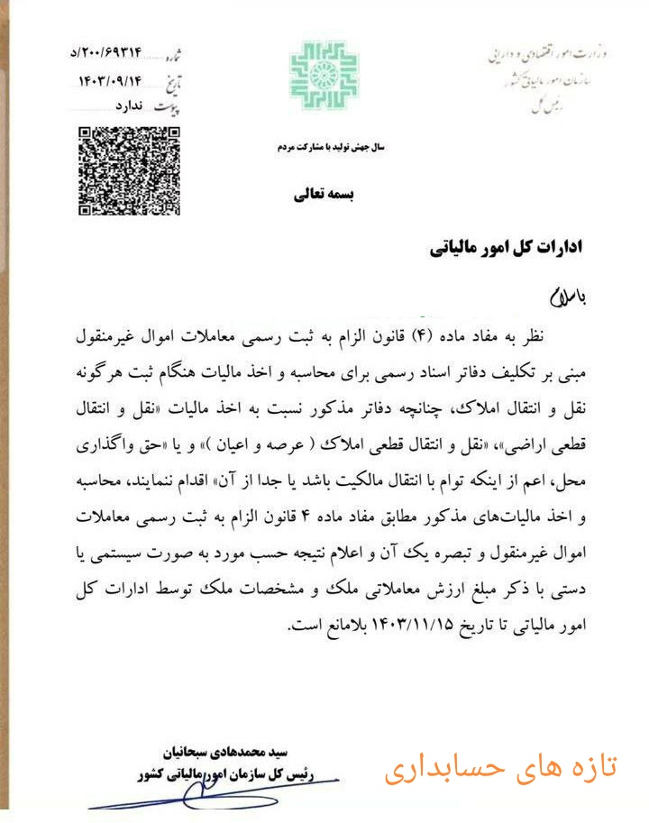 نظر به مفاد ماده (۴) قانون الزام به ثبت رسمی معاملات اموال غیر منقول مبنی بر تکلیف دفاتر اسناد رسمی برای محاسبه و اخذ مالیات هنگام ثبت هرگونه نقل و انتقال املاک چنانچه دفاتر مذکور نسبت به اخذ مالیات نقل و انتقال قطعی اراضی» نقل و انتقال قطعی املاک ) عرصه و اعیان )» و یا «حق واگذاری محل، اعم از اینکه توام با انتقال مالکیت باشد تا تاریخ ۱۴۰۳/۱۱/۱۵ بلامانع است.