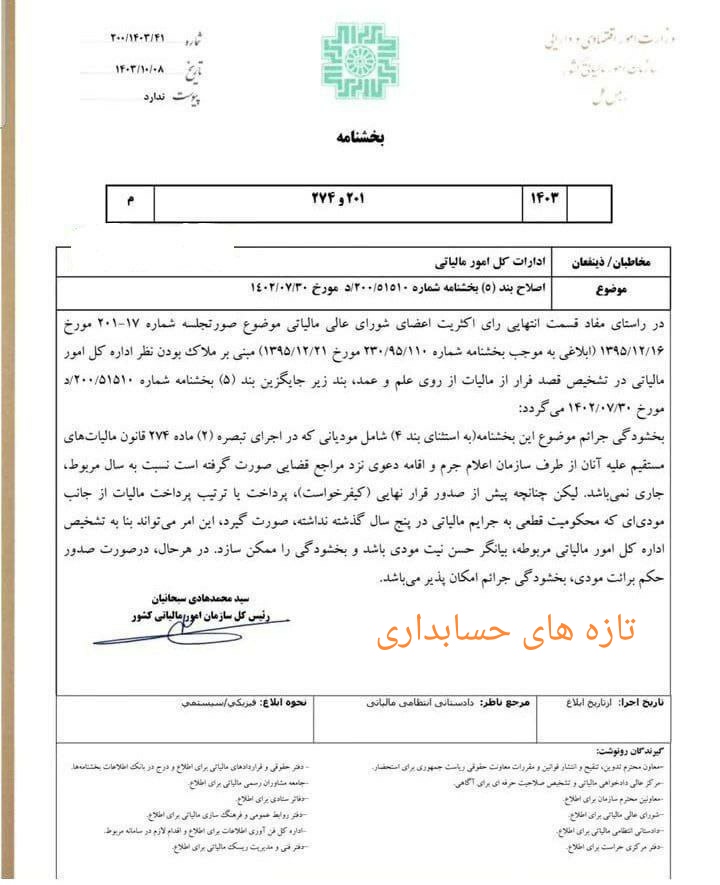 اصلاح بند ۵ بخشنامه ۵۱۵۱۰ بنا به رأی اکثریت اعضای شورای عالی مالیاتی در خصوص شکایت سازمان مالیاتی از مودی متخلف تبصره ۲۷۴ ق م م و عدم بخشش جرائم مالیاتی ابلاغ شد.