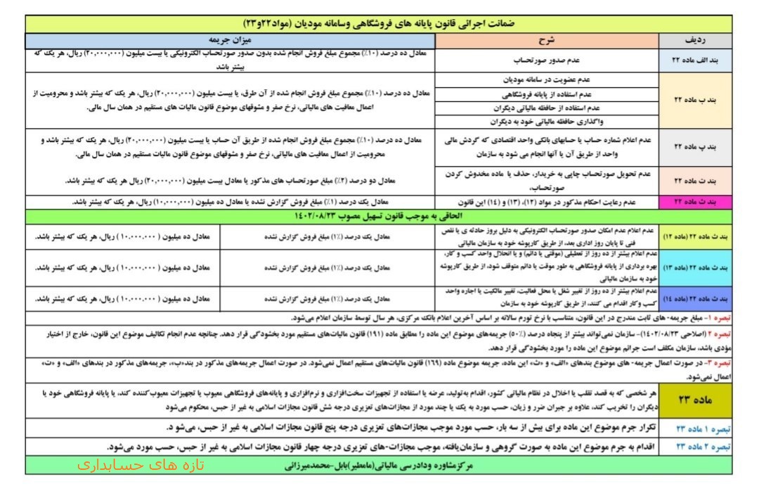 ضمانت اجرایی قانون پایانههای فروشگاهی و سامانه مودیان موضوع مواد ۲۲ و ۲۳ بدین شرح می باشد: