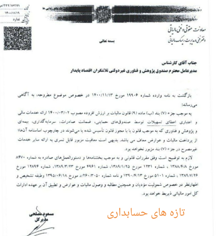 خدمات مالی و اعطای تسهیلات توسط صندوقهای حمایتی، ضمانت صادارات، سرمایه گذاری، بیمه ای و پژوهش و فناوری از پرداخت مالیات و عوارض بر ارزش افزوده معاف است.