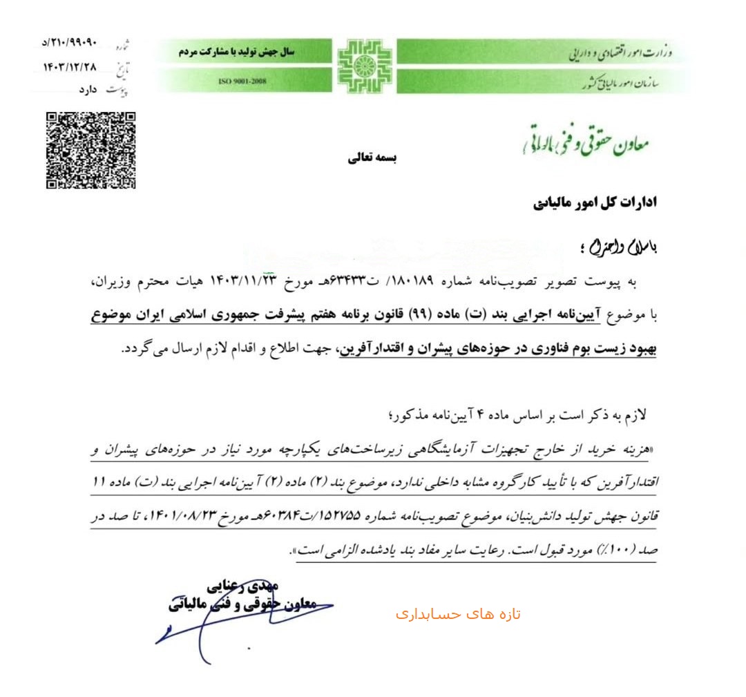 بموجب تصویبنامه هیات وزیران هزینه خرید از خارج تجهیزات آزمایشگاهی زیر ساخت های یکپارچه که مشابه داخلی ندارد تا صد درصد مورد قبول است.