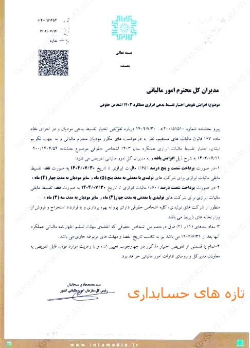 ، سازمان امور مالیاتی افزایش تفویض اختیار تقسیط بدهی ابرازی عملکرد ١۴٠٣ اشخاص حقوقی ر اعلام کرد.