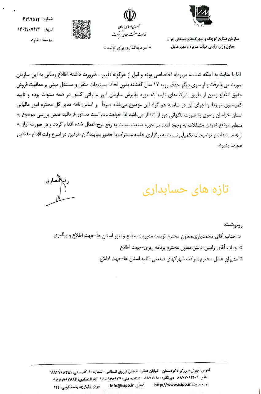 در مکاتبه مدیرعامل سازمان صنایع کوچک، موضوع معافیت ارزش افزوده شناسه اختصاصی فروش زمین و حقوق انتفاع (اموال غیر منقول)در شهرکهای صنعتی مورد تاکید قرار گرفت.