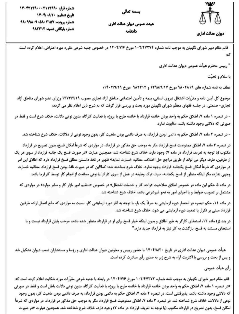 رای هیات عمومي دیوان عدالت اداری در خصوص قراردادهای کاری مناطق آزاد و پارکهای فناوری منتشر شد.