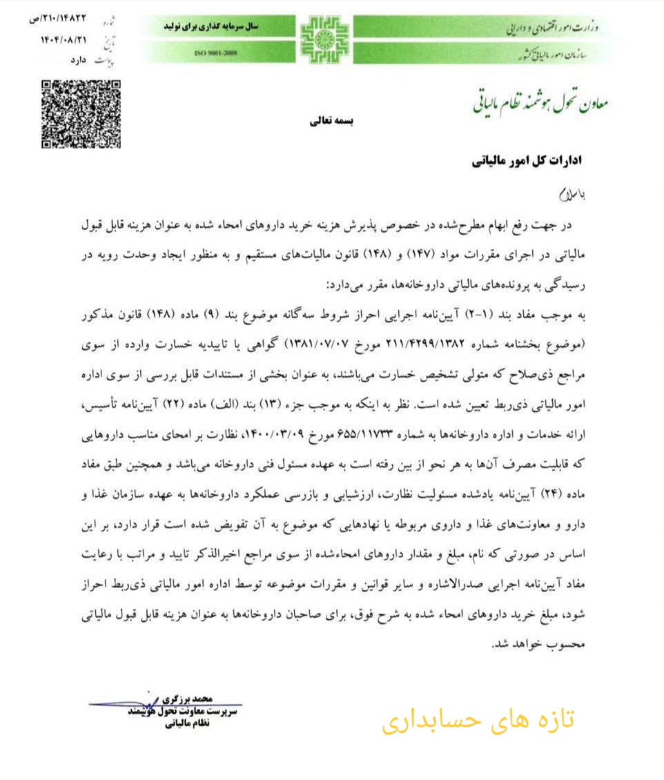 ابهام مطرح شده در خصوص پذیرش هزینه خرید داروهای امحاء شده به عنوان هزینه قابل قبول مالیاتی در اجرای مقررات مواد (۱۴۷) و (۱۴۸) قانون رفع شد.