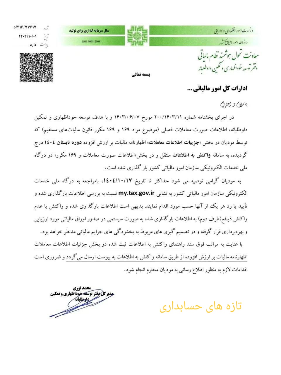 براین اساس مهلت بررسی جزییات اطلاعات معاملات برای ارزش افزوده فصل تابستان ۱۴٠۴ حداکثر تا ۱۷ دی ماه۱۴٠۴و لزوم بررسی واکنش ذینفع توسط مؤدیان تا تاریخ ۱۷/ ۱۰ / ۱۴۰۴ می باشد.