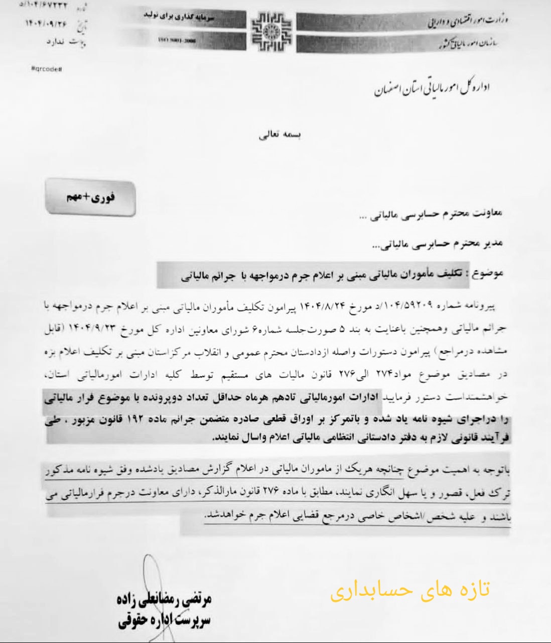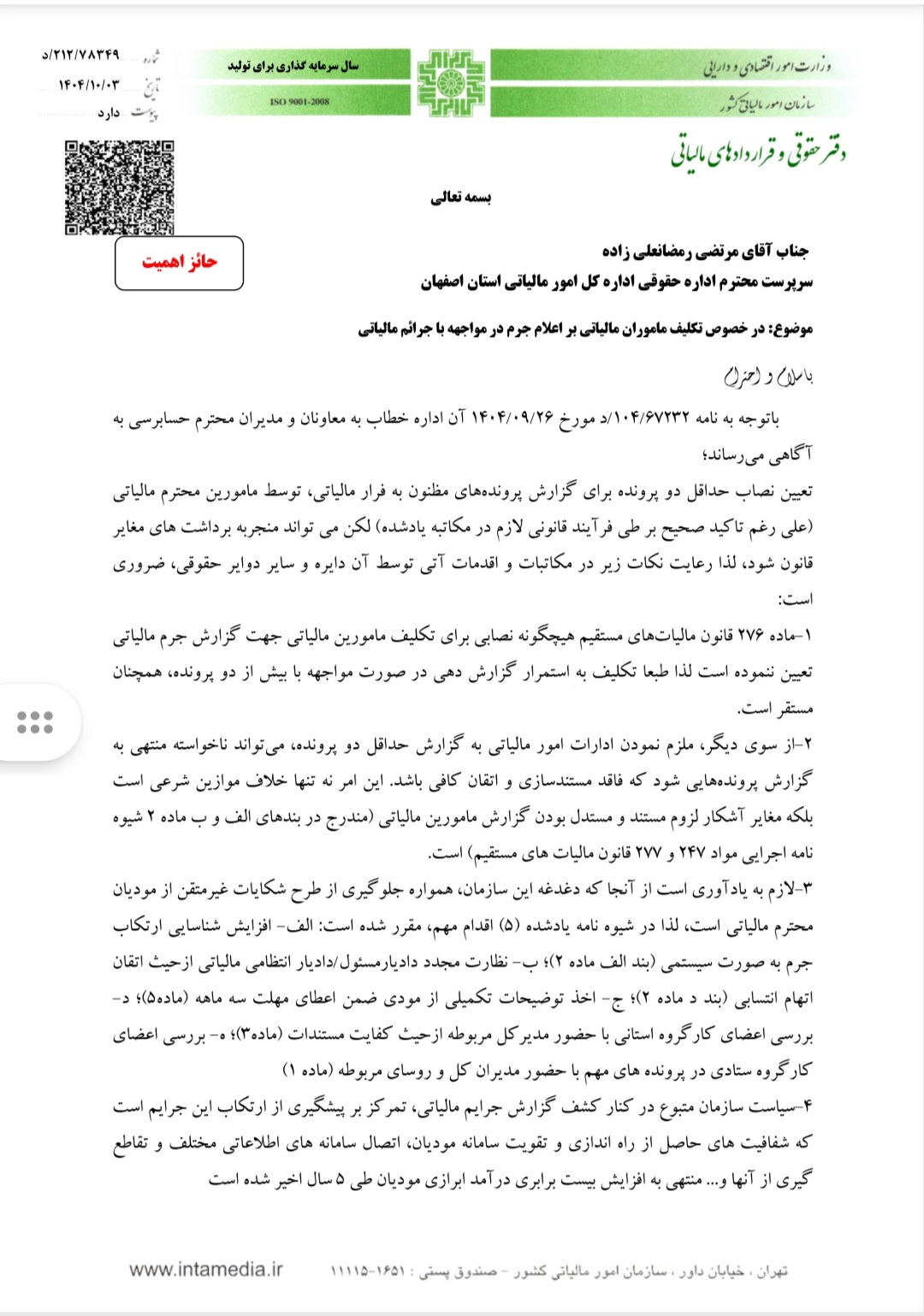 الزام ادارات امور مالیاتی به معرفی حداقل ده پرونده جرم مالیاتی در ماه توسط اداره امورمالیاتی اصفهان بخشنامه شد.