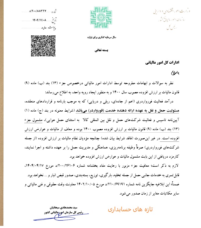 همچنین سازمان امور مالیاتی تاکید کرده است که این معافیت صرفا شامل خدمات حملونقل مذکور بوده و به خدمات جانبی مانند تخلیه، بارگیری، توزیع، بستهبندی و صدور قبض انبار تسری نمییابد.