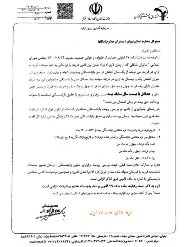بخشنامه نحوه بازنشستگی مادران شاغل موضوع بند (ت) ماده ۱۷ قانون حمایت از خانواده و جوانی جمعیت